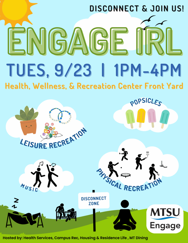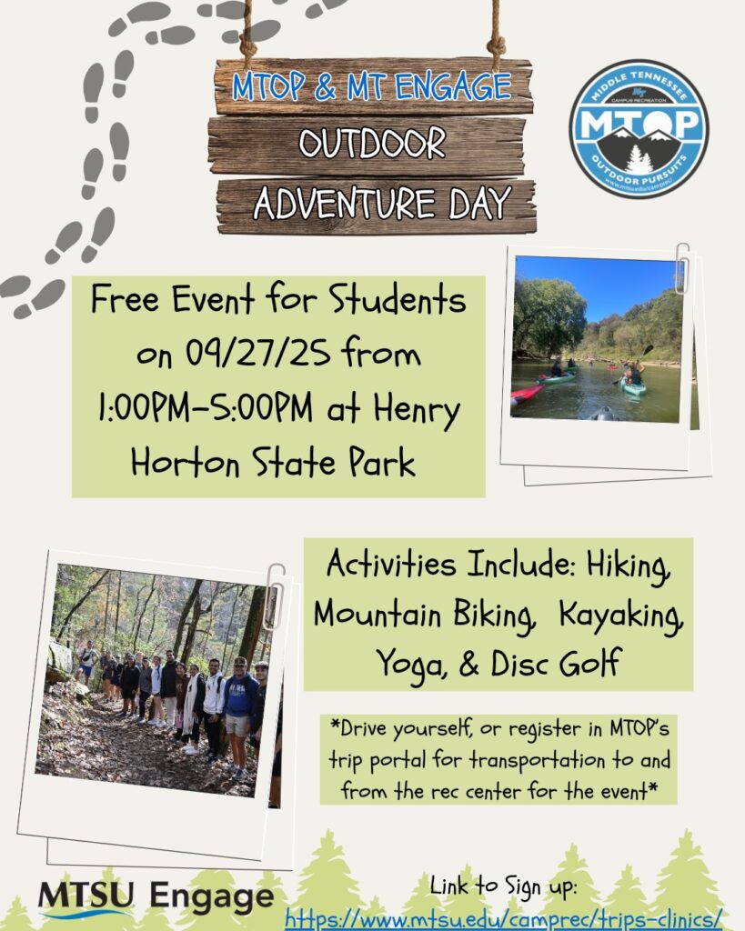 Come out and join us for MT Engage Outdoor Adventure Day on Sept 27th!! This a FREE event with the option of provided transportation. There will be hiking, kayaking, mountain biking, yoga and disc golf! This is a great opportunity if you are looking to get outside and meet some new people! If you need transportation register in at https://recportal.mtsu.edu/program?classificationId=371d0000-2742-447a-b1db-8023b6ba4d53.