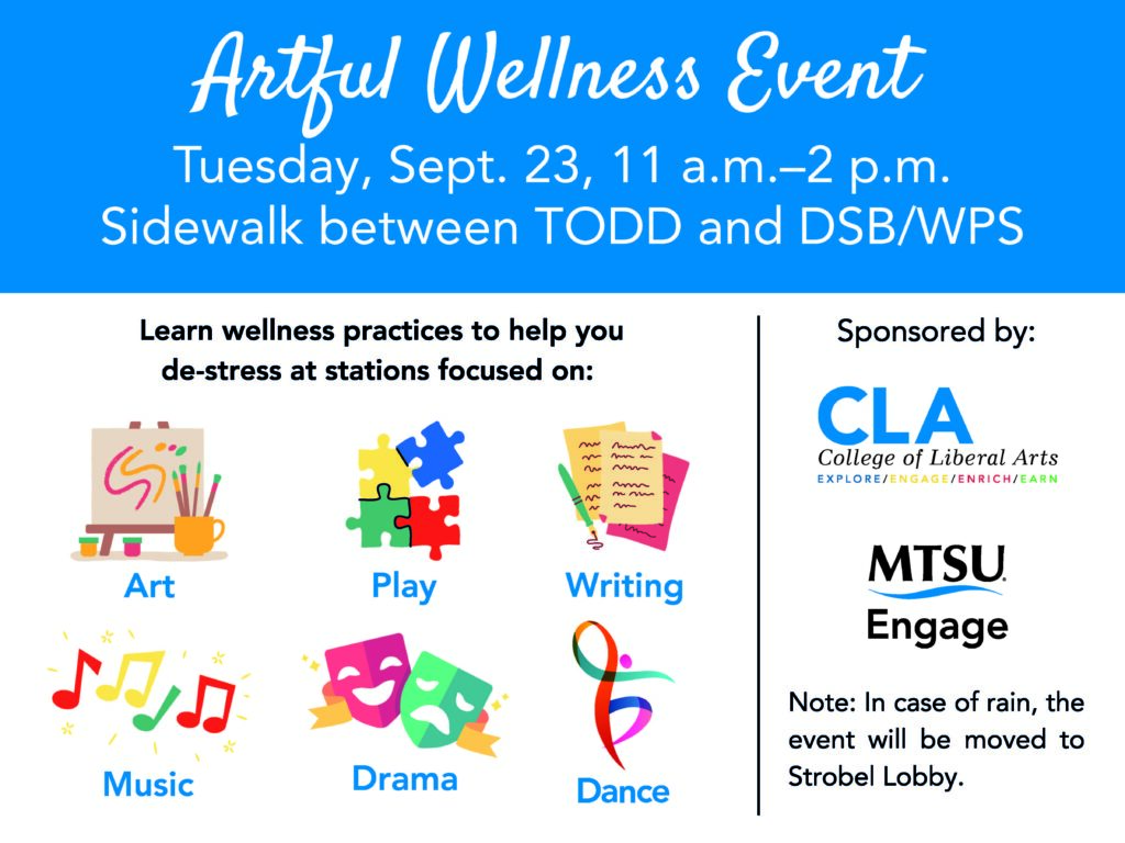 Stop by our stations to learn wellness practices designed to help you de-stress through the arts. Learn how art, play, writing, dance, music, and drama can enhance your life and improve your overall wellness.
