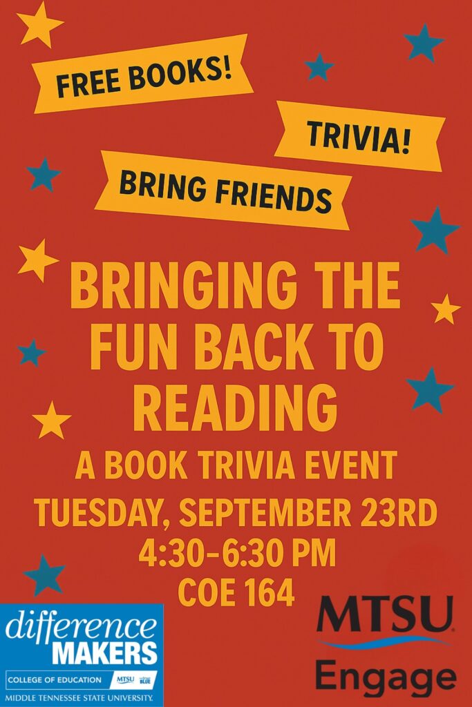 Join us for a Book Trivia Event filled with free books, fun trivia, and friends on Tuesday, September 23rd from 4:30–6:30 PM in COE 164! We’ll be highlighting exciting reads selected by children across Tennessee for the Volunteer State Book Awards. Don’t miss this high-energy celebration of reading, hosted by MTSU College of Education’s Difference Makers and Engage. Come for the fun, stay for the books!