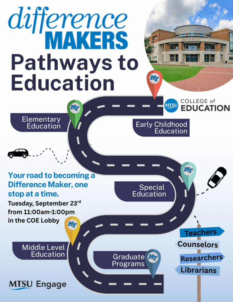 Find your road to becoming a difference maker! This event will showcase all that COE has to offer, from programs and student engagement opportunities to work and meeting spaces. During the fair, students will have the opportunity to engage in activities as well as to learn more about the various COE programs and services. Students will have access to additional information about pathways to educator licensure and career opportunities available with COE majors and minors.