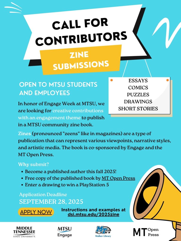 In honor of Engage Week at MTSU, we are looking for creative contributions with an engagement theme to publish in a MTSU community zine book.