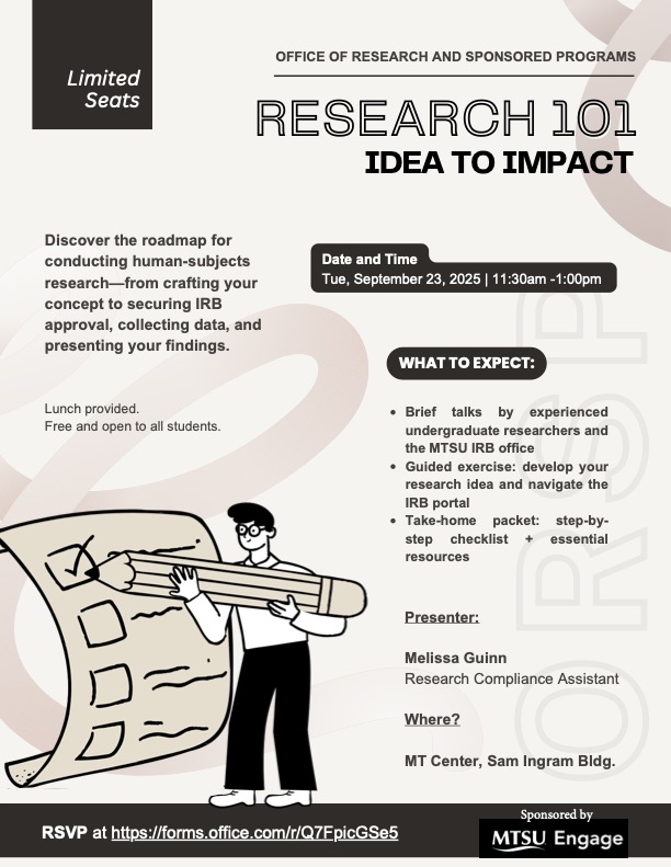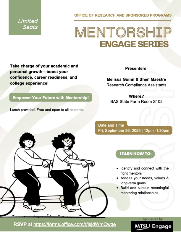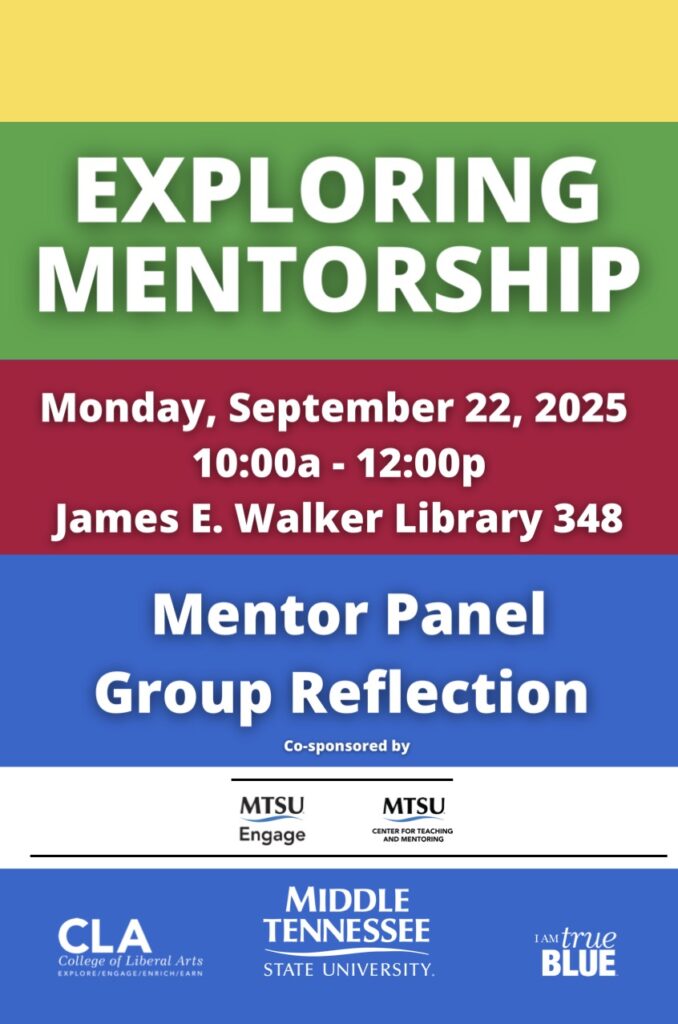 On Monday, September 22 in James E. Walker Library 348 from 10 am – 12 pm, College of Liberal Arts, with co-sponsorship from Engage and Center for Teaching & Mentoring, will host a panel of local community members to delve into mentorship. Panelists will share moments from their mentoring journey, including within their career, and their mentoring philosophy. This includes a small group discussion and one-on-one conversations for reflection on their stories and insights. Opportunities for mentorship on campus and in the community will be shared.