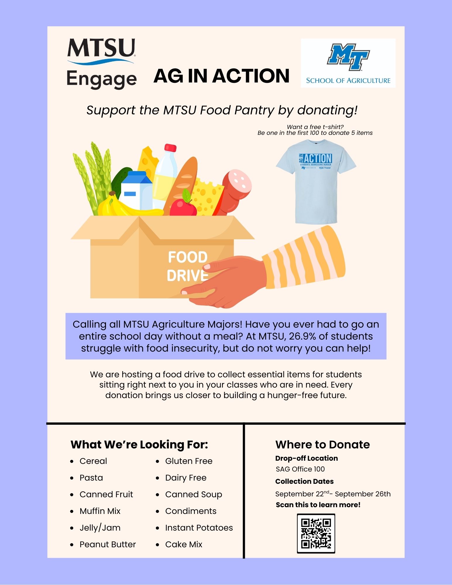 Calling all MTSU Agriculture Majors! Have you ever had to go an entire school day without a meal? At MTSU, 26.9% of students struggle with food insecurity, but do not worry – you can help!