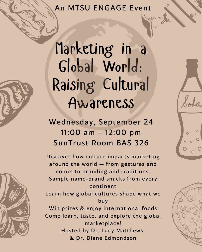 With information from around the world becoming more readily accessible, it is important for students to understand the global marketplace. This event will teach students about cultural differences from around the world (e.g., gestures, colors, language translations, traditions). In addition, students will learn how these cultural differences impact marketing. As part of this event, students will be given the opportunity to try a variety of name brand food-based products from each continent (e.g., Asia, Africa, Europe, South America, Australia). Students will also engage in hands-on activities to recognize the vast amount of consumer goods they possess that are produced internationally. In order to encourage student participation, international foods, and other prizes will be provided.