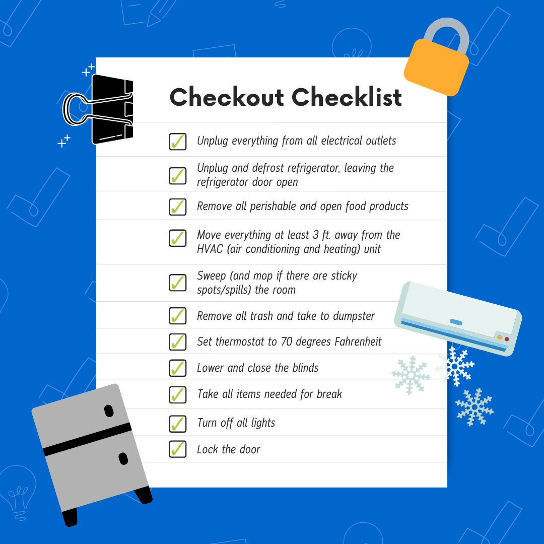 - Take all items needed for break (you will not have access to the building over break, no exceptions)