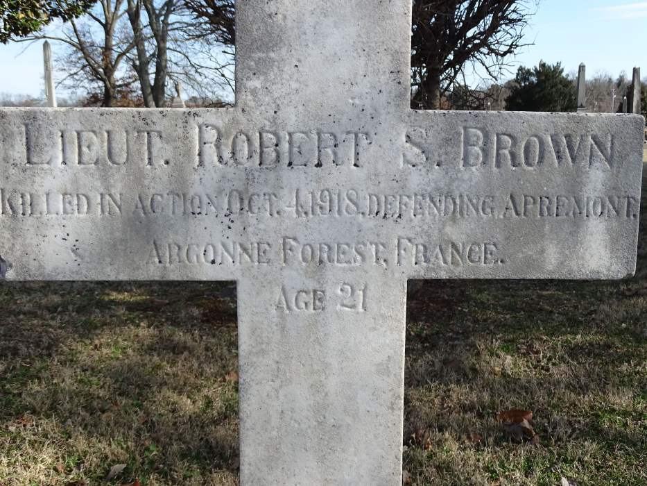 Robert Shearer Brown (Jan. 22, 1897 – Oct. 4, 1918) completed his Junior Year at the University of Tennessee. In July 1917, he trained at Camp Sevier in South Carolina and was commissioned as a 2nd Lieutenant. He deployed to France in May 1918 and served with the 109th Regiment of the Army’s 28th Infantry Division. He participated in the battles of Chateau-Thierry and Aisne Marne before and was promoted to 1st Lieutenant. In September 1918. Lieutenant Brown and his 113th Machine Gun Battalion was defending the village of Apremont, Departement des Ardennes, Champagne-Ardenne, France in the Argonne Forest when he was killed in action in October 4th, 1918 (age 21). His grave is at Evergreen Cemetery, Murfreesboro, Rutherford County, Tennessee.