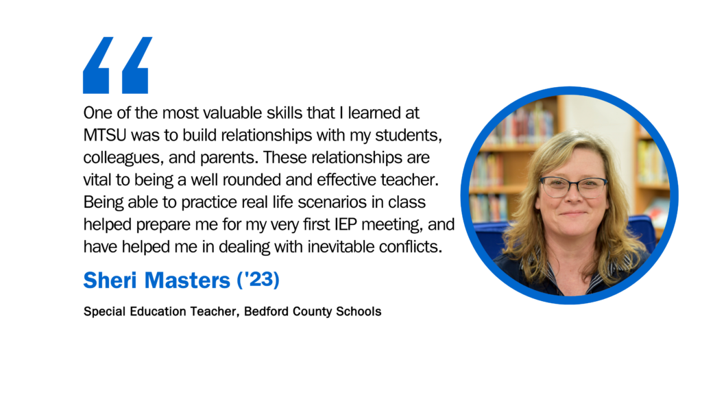 The BS Special Education disclosure provided on MTSU’s professional licensure disclosure website indicates the states and territories where MTSU has determined, through reasonable and good faith effort, that the program does or does not meet the educational requirements for other US states and territories. Licensing authorities for each state set and enforce their own requirements and standards, which are subject to change. Current and prospective students not located in Tennessee or who plan to seek licensure or certification outside the state of Tennessee should contact the appropriate state licensing agency or board and discuss their plans with an advisor and the MTSU Office of Teacher Licensure before enrolling in the program to ensure they have the most up-to-date information and guidance regarding licensure requirements.