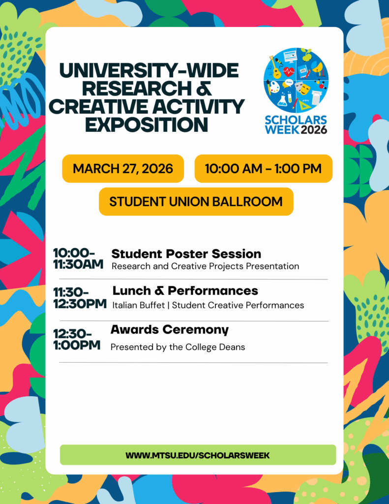 Scholars Week is a week-long tradition during which MTSU’s academic colleges celebrate scholarship, research, and creative activity through a variety of events and activities hosted by academic departments and colleges.